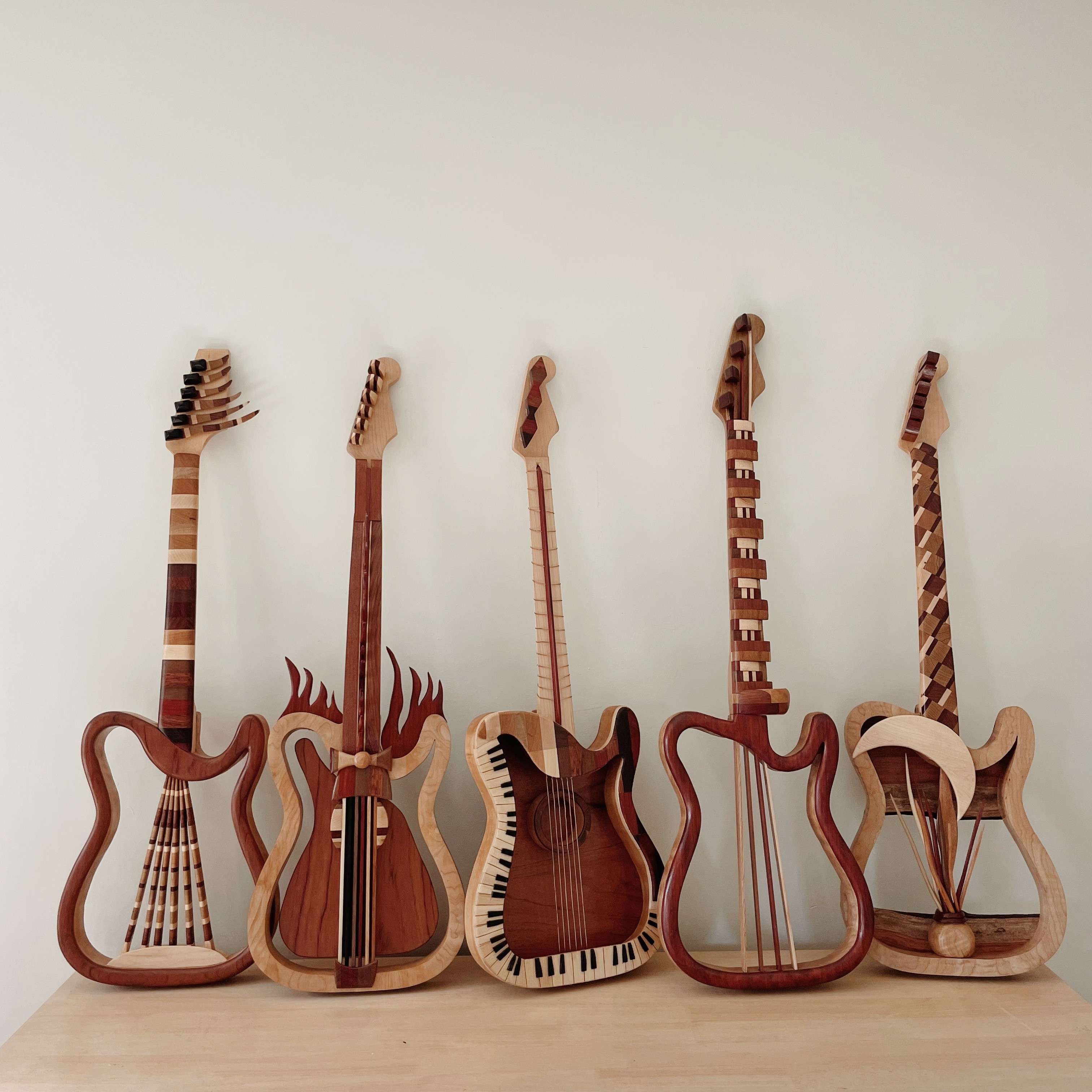 His creations range from display and coffee tables to whimsical fantasy guitars and dolphin mobiles, all made of unstained hardwood.